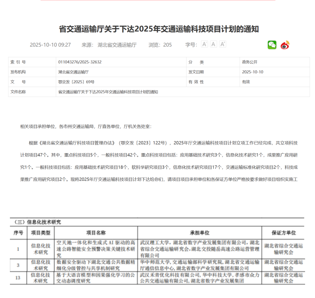 湖北聯(lián)投數(shù)產(chǎn)集團三項課題入選湖北省交通廳2025年科技項目立項計劃