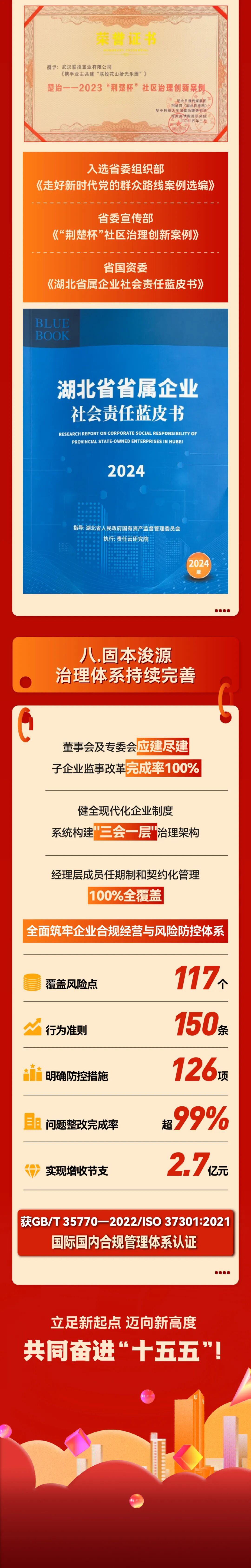 “十四五”以來,湖北聯(lián)投以黨的科學(xué)理論為炬,在省委省政府的堅強(qiáng)領(lǐng)導(dǎo)下,在省政府國資委的關(guān)心指導(dǎo)下,堅持思想向支點聚焦,力量向支點集中,行動向支點發(fā)力,從產(chǎn)業(yè)園區(qū)中“鏈的聚勢”到“群的躍升”,從城市發(fā)展中的街巷“更新”到生活“煥新”,從工程建設(shè)的“單兵作戰(zhàn)”到“全鏈競逐”,從“兩山”實踐中的“生態(tài)包袱”到“綠色財富”,從首進(jìn)“中國企業(yè)500強(qiáng)”并持續(xù)躍升至180位,到實現(xiàn)資產(chǎn)規(guī)模、營收利稅翻番……每一天都是新跨越,每一步都有新風(fēng)采。