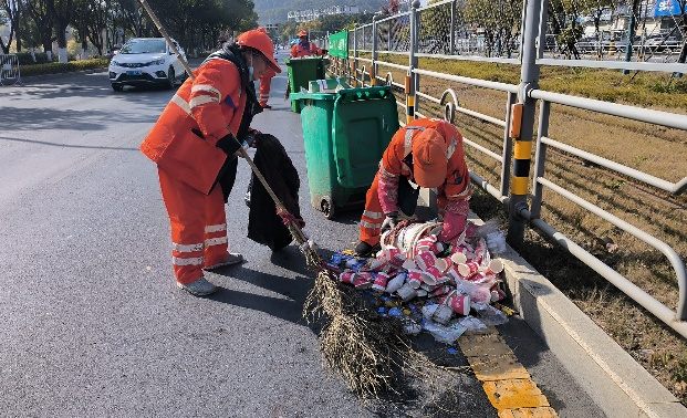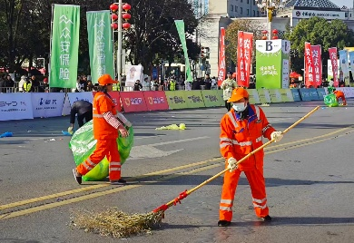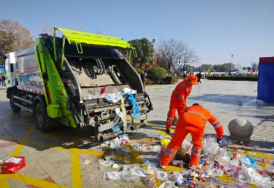 賽事結(jié)束后,項目團隊立即轉(zhuǎn)入賽后恢復(fù)作業(yè)模式,迅速開啟“人機”協(xié)同,對賽道沿線遺留的紙杯、包裝物等賽事垃圾進行集中清理、分類轉(zhuǎn)運。累計清理200余處衛(wèi)生死角,清運賽事垃圾約30余噸,并在1小時內(nèi)還原道路潔凈,以最快速度使城市環(huán)境與秩序回歸常態(tài)。