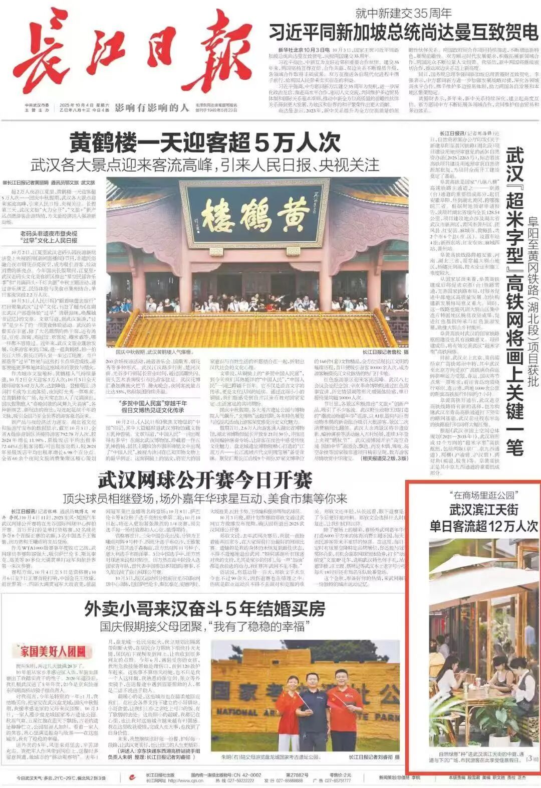 10月4日,長江日?qǐng)?bào)頭版刊發(fā)《“在商場(chǎng)里逛公園” ,武漢濱江天街單日客流超12萬人次》一文,介紹湖北聯(lián)投清能集團(tuán)與龍湖集團(tuán)聯(lián)袂打造的武漢濱江天街國慶假期盛況。作為武漢首個(gè)自帶1.3萬平方米綠地公園的商業(yè)綜合體,其融合自然景觀與商業(yè),成為市民休閑消費(fèi)新選擇。以下為報(bào)道全文: