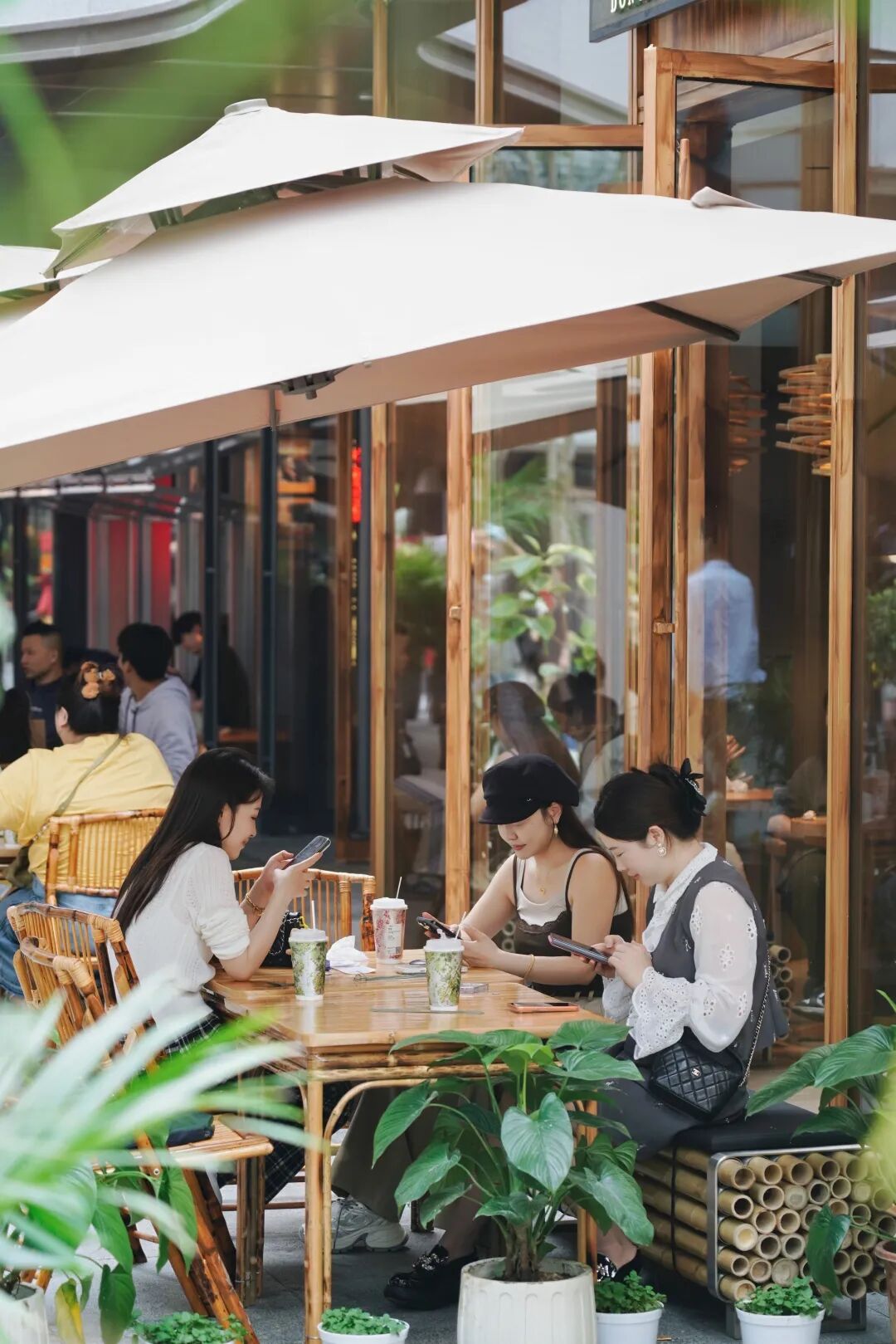 一棵近三層樓高的“大樹”屹立于室內(nèi),坐在樹下品一杯咖啡,抬頭便透過22米高的玻璃幕墻,將窗外奔流的江景盡收眼底。10月2日傍晚,24歲的小陳和幾位朋友相約在湖北聯(lián)投武漢濱江天街的“沐光島”中庭。漫灑的霞光、縈繞的綠意之間,他們享用了一頓氛圍感十足的晚餐。