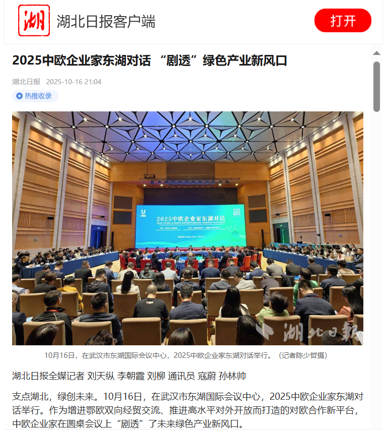 湖北日報:2025中歐企業(yè)家東湖對話 “劇透”綠色產(chǎn)業(yè)新風口